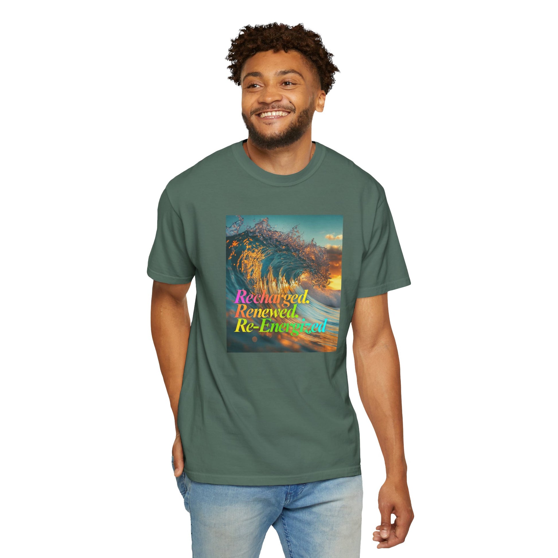 This heavyweight, garment-dyed tee carries the warm, sunlit hush of a shoreline morning right into your everyday. A square, painterly wave print sits across the chest — colors melt from turquoise to molten gold while layered text reads “Recharged. Renewed. Re-Energized.”